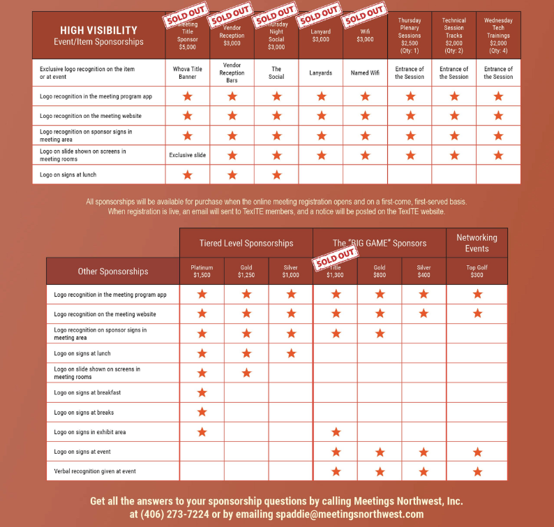 Sponsors will have numerous marketing opportunities to showcase their organization to our community of transportation professionals. We thank you for considering being a Sponsor and look forward to partnering with you for a successful meeting.